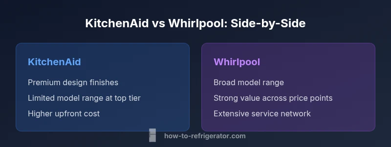 Choosing between KitchenAid refrigerators and Whirlpool models involves weighing premium design against broad affordability. The KitchenAid lineup is anchored in premium finishes, specialty configurations, and a design-forward aesthetic, often appealing to homeowners who place a premium on kitchen cohesion. Whirlpool, by contrast, emphasizes variety across sizes, configurations, and price points, aiming to cover more homes with fewer compromises on core features. For homeowners, the decision often hinges on three questions: which brand aligns with existing kitchen hardware, what level of premium features are desired, and what budget is acceptable for total cost of ownership. According to How To Refrigerator, the premium tier from KitchenAid tends to emphasize texture, lighting, and interior organization, while Whirlpool invests in broad access to service, warranty options, and a wider range of entry-level options. The field of competitive refrigerators continues to evolve as energy efficiency standards tighten and smart features proliferate. In this guide we compare product strategies, performance characteristics, and ownership implications to help homeowners make an informed choice that matches their needs.