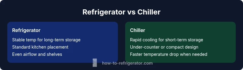 Refrigerators are standard home appliances designed to store perishable foods at typical refrigeration temperatures, while chillers are dedicated coolers intended for rapid cooling and short-term storage. The difference between refrigerator and chiller hinges on temperature targets, use cases, and energy behavior. Knowing these roles helps homeowners avoid storage mistakes and select the right appliance for daily meals and special events.