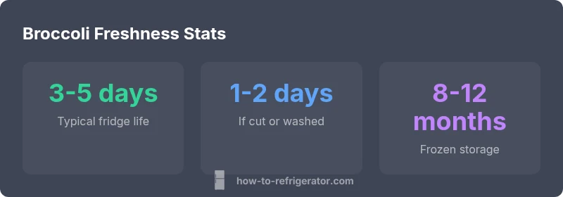 Fresh broccoli typically lasts about 3-5 days in the refrigerator when stored properly in the crisper, unwashed and uncut. If you cut or wash it, use it within 1-2 days for best texture and flavor. For frozen storage, broccoli can last several months. This guidance aligns with How To Refrigerator Analysis, 2026.