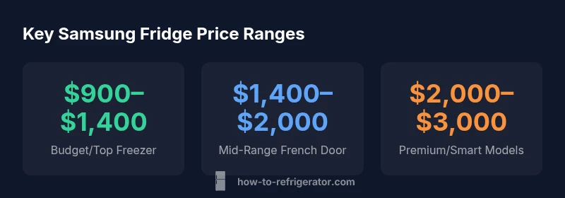 According to How To Refrigerator, price is not a single number but a spectrum determined by model family, capacity, and technology. The question how much is a samsung refrigerator often yields different answers depending on size, doors, and features. Lower-cost Samsung fridges focus on essential cooling and basic energy efficiency, while premium French-door or smart-enabled models incorporate advanced ice systems, Wi‑Fi connectivity, and extended warranties. In 2026, buyers should expect price bands that reflect these tiers and the cost of installation and hauling. Regional promotions and retailer discounts can also move a given model into a higher or lower price tier, so shoppers should check multiple sources before purchasing. The big takeaway is that you’re choosing a value tier, not a single price.