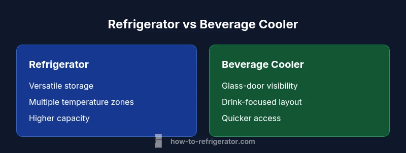 Refrigerator vs Beverage Cooler: The two appliances share storage goals, but they serve different duties. A fridge provides versatile, multi-food storage with precise temperature control, drawers, and shelves for perishables. A beverage cooler prioritizes drinks, visibility, and quick access, often at a smaller footprint. For homeowners, the choice hinges on use‑case, space, and budget. The How To Refrigerator team notes this as a core decision driver.
