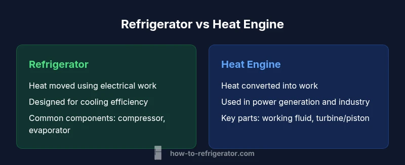 In everyday homes, the phrase refrigerator vs heat engine highlights two foundational ideas in thermodynamics. According to How To Refrigerator, understanding these concepts helps homeowners interpret energy labels, diagnose cooling problems, and make smarter fixes. A refrigerator is a heat pump that uses electrical energy to move heat from a cold interior to a warmer exterior. It consumes work to relocate heat rather than to generate it. By contrast, a traditional heat engine takes in heat from a high-temperature source and converts part of that heat into useful work, with the rest released to the environment.