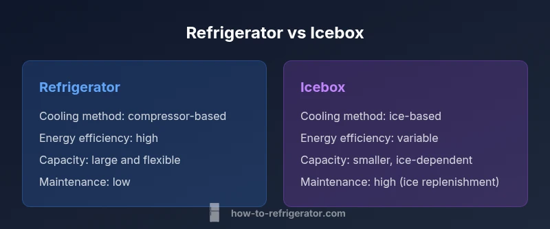 A modern refrigerator uses a closed-loop refrigerant cycle powered by a compressor, expansion valves, and evaporator coils to actively remove heat from the interior. An icebox, by contrast, relies on external ice blocks or bags to absorb heat through insulation. This fundamental difference affects efficiency, maintenance, and reliability. As you compare refrigerator vs icebox options, note that compressors enable precise temperature control, humidity management, and defrost cycles, while ice-based cooling depends on the availability of ice and the quality of insulation. How To Refrigerator notes that the efficiency and predictability of compressor-driven units tend to outperform ice-based systems in most home environments, especially where climate and power availability are stable.
