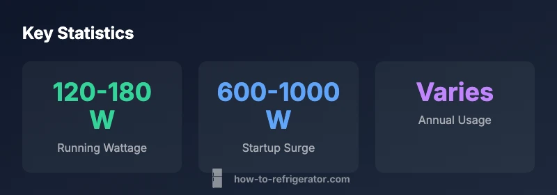 According to How To Refrigerator, the answer to how many watts do a refrigerator use depends on compressor size, cycling patterns, and energy class. In typical households, a modern fridge runs at about 120-180 watts during steady operation, while startup surges can reach 600-1000 watts for brief bursts. The actual wattage is influenced by door openings, ambient temperature, and thermostat settings. Understanding these mechanics helps homeowners estimate running costs and plan for energy efficiency. The running wattage is the sum of several subsystems: the compressor when it is active, the condenser fan, the defrost heater (as needed), and the internal electronics. Even within a single model line, wattage can vary a bit by production year and installed refrigerant charge. By recognizing these pieces, homeowners can better predict energy use across seasons and occupancy patterns.