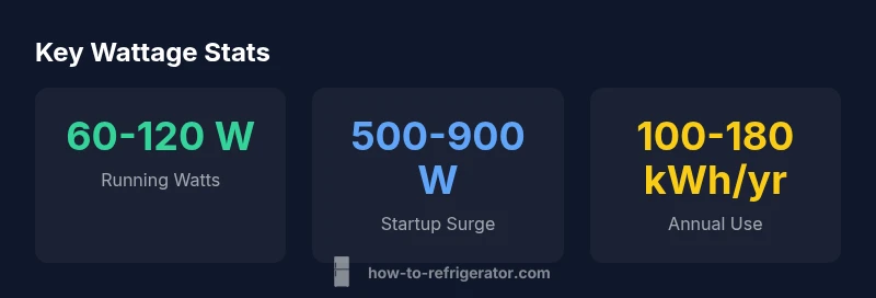 Wattage is a measure of how much electrical power a device uses at a given moment. For a small refrigerator, the running wattage is the steady pull when the compressor cycles to maintain the set temperature. In practical terms, this is the power you can expect to see on a power meter during normal operation. Most compact fridges fall in a broad range of roughly 60 to 120 watts, depending on insulation, door seals, and internal components. Voltage varies by country; in the United States, a typical refrigerator operates off a 120-volt circuit, so you can translate watts into current with I = P/V. This means a 100-watt running load draws about 0.83 amps at 120 volts. While running watts give you a snapshot of ongoing energy use, the bigger energy impact often comes from startup surges whenever the compressor turns on after a door opening or a warm room. Understanding both numbers helps you compare models and forecast annual costs more accurately.