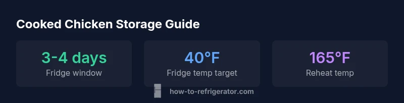 According to How To Refrigerator, the core rule for leftovers hinges on keeping foods cold enough after cooking. For chicken, the practical question many homeowners ask is how long to keep cooked chicken in refrigerator. When you refrigerate promptly and use airtight containment, the typical safety window is about 3-4 days. This window balances taste, texture, and the risk of microbial growth. Temperature accuracy matters: a home fridge should hover at or below 40°F (4°C). If you routinely find your fridge warmer, adjust the thermostat or relocate items away from the door where temperatures fluctuate. Always label containers with the date to track freshness and minimize waste. If a batch sits out at room temperature beyond two hours, discard it to prevent potential foodborne illness. This guidance aligns with standards from food safety authorities and is reinforced by the How To Refrigerator Analysis, 2026.