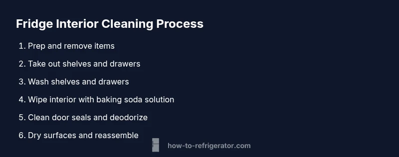 This section provides a practical overview of the process. Start by removing all items from the fridge and taking out shelves and drawers. Wash the removable parts in warm, soapy water, rinse, and dry thoroughly. Prepare a gentle cleaning solution using baking soda and water; wipe the interior walls, ceiling, and corners, paying attention to spots with sticky residues. Clean the door gaskets with a soft brush to remove grime without tearing the seals. Deodorize the cavity by sprinkling baking soda or placing an open box in the bottom for several hours. Finally, dry all surfaces completely and reassemble the shelves and drawers before returning the food. A clear, systematic approach helps you avoid recontaminating clean surfaces and keeps the fridge fresh longer.
