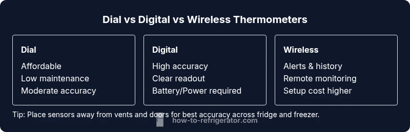 There are several thermometer technologies to consider for refrigerator and freezer use. Dial thermometers use a traditional analog dial with a needle that points to the temperature; they are inexpensive, low maintenance, and easy to read at a glance, but can be less precise at the extremes or as they age. Digital thermometers provide numeric readings, often with faster response times and higher accuracy, and many offer memory or minimum/maximum (min/max) recording. Wireless thermometers connect to a base unit or smartphone app, enabling remote monitoring, alerts for out-of-range temperatures, and historical data. Some models integrate both fridge and freezer probes, while others come with single probes that can be positioned in either compartment.