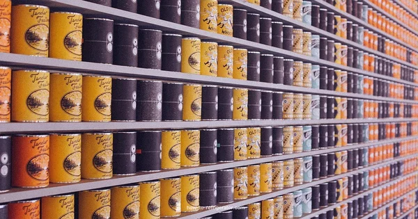 Place unopened cans on a shelf away from the fridge door to minimize temperature fluctuations. Avoid stacking cans too high where items could knock them over or damage the cans.