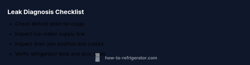Water pooling near or under your refrigerator is not normal. When you search for the phrase refrigerator leaking, you’re likely dealing with excess condensation, a blocked defrost drain, a leaking water line, or a cracked drain pan. The defrost drain is the single most common source of leaks in modern, frost-free models, because meltwater has to travel from the freezer compartment to a drip pan. In many homes, a simple clog or misalignment is enough to trigger a spill. According to How To Refrigerator analysis, homeowners who identify the exact leak source quickly reduce repair time and prevent ceiling, floor, and cabinet damage. This guide explains the main sources, how to differentiate them, and safe steps you can take immediately. Always unplug before touching electrical components and avoid sharp tools on plastic tubing. The objective is a fast, safe fix and to minimize future leaks.