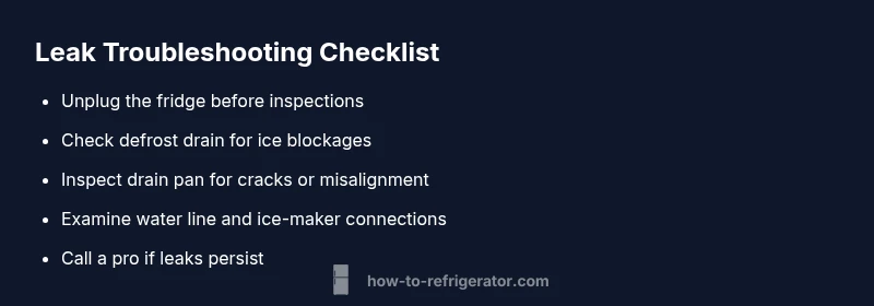 To troubleshoot efficiently, follow a simple diagnostic flow: note where the leak pools, inspect the defrost drain for ice or blockages, verify drain pan seating, check door seals for gaps, and confirm the water line connections. If water is coming from the freezer, the defrost drain is likely the culprit. If the water is pooling under the fridge but not near doors, the drain pan or installation may be the issue. Use a clean funnel and warm water to clear clogs when you suspect a blocked drain. Always re-check after each step and document what changes. This methodical approach minimizes guesswork and speeds up a resolution. Based on How To Refrigerator research, many leaks are resolved by addressing defrost drainage and pan alignment quickly, but stubborn leaks may require professional diagnosis to rule out condenser or evaporator issues.