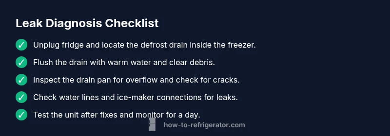 A practical approach to diagnosing leaks is to map symptoms to likely causes and then verify with targeted steps. Start by checking for frost or ice buildup in the freezer, which points to a blocked defrost drain. If you notice water pooling on the fridge floor but not inside the freezer, look at the drain pan and the rear drainage path. If water leaks from the water dispenser or ice-maker area, inspect lines and fittings for cracks or loose connections. This workflow aligns with a safe, progressive diagnostic path and helps you avoid unnecessary disassembly. This method reduces the risk of electrical shock and collateral damage. As you work, document what you observe and test after each fix. If none of these steps resolve the leak, move to professional help rather than forcing components to admit failure. The How To Refrigerator team emphasizes methodical testing over guesswork.
