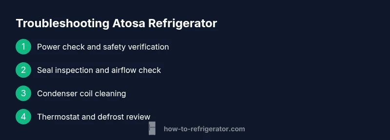 Atosa refrigerators are designed for reliability in busy kitchens, offering a range of capacities and layouts suitable for home and light commercial use. The overall goal is stable temperatures, energy efficiency, and durable components that stand up to frequent door openings. When troubleshooting an atosa refrigerator, start with the basics: confirm power, inspect door seals, check airflow, and verify that dense items aren’t obstructing vents. According to How To Refrigerator, homeowners can safely troubleshoot using a structured checklist, which minimizes risk and makes complex problems feel manageable. The How To Refrigerator team emphasizes that following a predictable process reduces guesswork and helps you document problems for potential service visits. Throughout this guide, you’ll see practical steps to isolate issues, plus notes on the common parts most likely to fail in atosa refrigerator models.