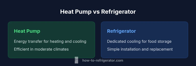 According to How To Refrigerator, understanding the difference between heat pump and refrigerator is essential for homeowners evaluating climate control and food preservation. The keyword here, difference between heat pump and refrigerator, captures two very different appliance families that share a common technology: refrigeration cycles and controlled energy transfer. A heat pump is a reversible system designed to move heat in or out of a space, providing heating in winter and cooling in summer. A conventional refrigerator, by contrast, is dedicated to keeping food cold and preventing spoilage by removing heat from a sealed compartment. The How To Refrigerator team found that many homeowners confuse these devices because both rely on compression, refrigerants, and heat exchange, yet their goals, installation needs, and operating contexts diverge significantly. In this article, we unpack the distinctions, using practical benchmarks that homeowners can apply when troubleshooting and selecting solutions.