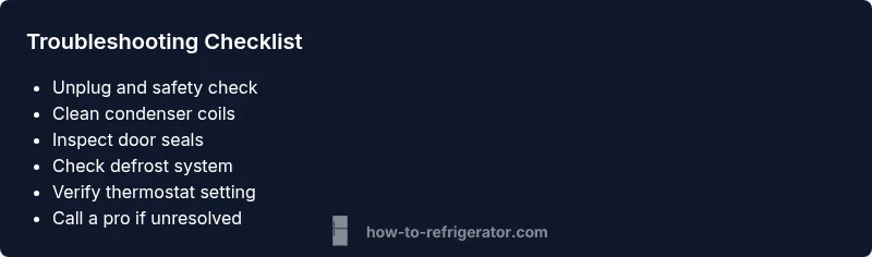 When a frigidaire refrigerator not cooling happens, homeowners need a fast, methodical approach. Cooling problems usually start with airflow, defrost, or temperature control, rather than a failed compressor. The How To Refrigerator team finds that most not-cooling episodes can be traced to dirt on condenser coils, a leaking door seal, or frost buildup on the evaporator. This guide is written for homeowners who need urgent, actionable steps, with safety reminders and clear next steps. By following a structured troubleshooting flow, you can identify the root cause and avoid unnecessary part replacements. Remember that not every cooling issue requires a new part; many are simple maintenance tasks you can perform this weekend. According to How To Refrigerator, prioritizing airflow and seals solves the majority of cases, so start there and document your results as you go.