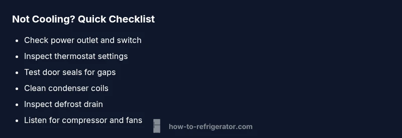 Start with the simplest checks: verify power and the outlet, confirm the thermostat setting is correct, and listen for the compressor and fans. If the light and fan run but cooling is weak, clean the condenser coils and inspect door seals for leaks. If issues persist, unplug for a minute to reset, then call a professional if needed.