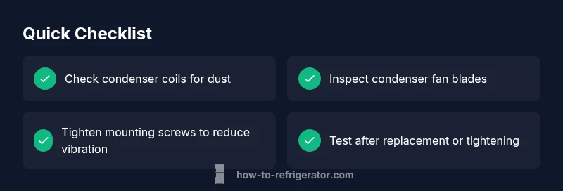 - Safety check and power down: Unplug the fridge and switch off the circuit. 2) Access the condenser: Remove the back access panel or front grille as needed to reach the condenser coils and fan. 3) Inspect the condenser fan: Look for bent blades, debris, or ice buildup around the fan. 4) Clean and free the path: Clear dust, hair, and debris from the fan and coils; vacuum or brush gently. 5) Realign or secure: If the fan is loose, reseat and tighten mounting screws; ensure there is no interference from wires. 6) Test run: Plug back in and listen at a distance to confirm the hum is reduced; reassemble panels if quiet. If the fan spins but the hum persists, the compressor or motor bearings may be failing. In that case, stop and call a professional to avoid risk of refrigerant exposure or electrical shock. Tip: Keep a service log and note any changes in noise after each step.