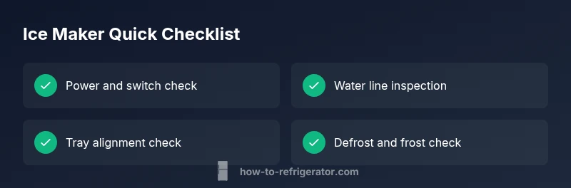 If your refrigerator is not making ice, you’re not alone. In many homes, the culprit is a simple misconfiguration or a jam in the ice system. The How To Refrigerator team notes that the first step is to systematically check power and basic settings before diving into components. Common causes include a disabled ice maker switch, a full or misaligned ice tray, a blocked water line, or a malfunctioning defrost timer. By walking through these items in order, you often restore ice production without tools. Remember to verify the freezer is at the correct temperature and that the ice bin is properly seated. Rushed repairs lead to repeated failures, so take your time and document what you find for future prevention. The goal is to resolve the issue quickly and safely, with minimal disruption to your kitchen routine.