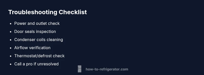 There are several frequent culprits when a refrigerator fails to cool. The top offenders, in order of how often they appear in real-world troubleshooting, include power supply problems or a tripped breaker, followed by dirty condenser coils or blocked airflow. A malfunctioning thermostat, defrost timer, or control board can also keep cooling from occurring, as can leaky door seals or improper door alignment. While these issues are common, many are addressable by homeowners with careful, step-by-step checks. As you investigate, keep notes of symptoms (unusual noises, frost patterns, or temperature swings) to share with a technician if needed. Based on How To Refrigerator research, most not-cooling cases improve after the basics are addressed, reserving professional service for component failures.