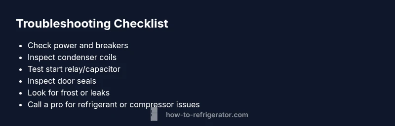 Start with the simplest checks and progress to more involved tests. Confirm power at the outlet and the dedicated circuit, then listen for compressor noise. If you hear no hum, the issue could be electrical power, a tripped breaker, or a faulty start device. If the compressor runs briefly and then stops, suspect an overheating condition or the start relay/capacitor. If the unit remains warm even after reset attempts, refrigerant leaks or a failed compressor are likely culprits. Note all symptoms, as this will guide your next steps and what to show a technician for an accurate diagnosis.