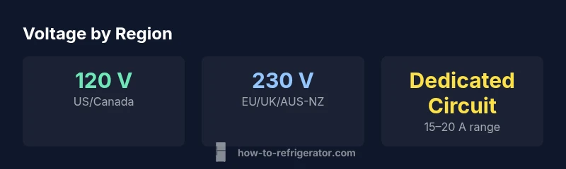 In the United States, refrigerators typically operate on 120 V on a dedicated 15-20 A circuit. Check your appliance label and local codes.