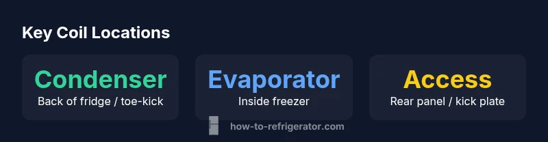 Coils in most homes are either behind a rear grille at the back of the fridge or under the toe-kick, forming the condenser that dissipates heat from the refrigerant. Knowing exactly where they are helps you inspect for dust, vibration, or damage. Because coil access varies by model, consult your owner’s manual for your specific location. For many models, you’ll locate the condenser coils first; evaporator coils are usually tucked inside the freezer. If you’re unsure, contact the How To Refrigerator team for model-specific guidance. where are refrigerator coils