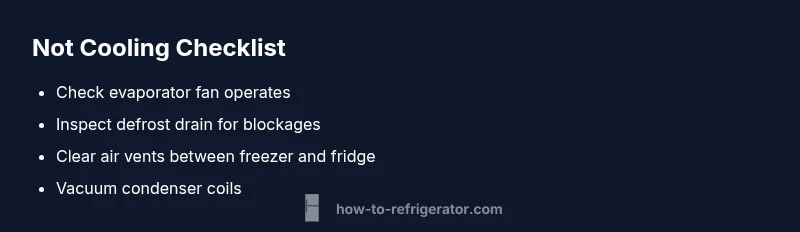 If you’re puzzled by a fridge that simply won’t chill while the freezer remains solid, you’re not alone. This pattern is more common than you might think and can be resolved without a full appliance overhaul. According to How To Refrigerator, diagnosing this issue starts with safe, methodical checks rather than guessing at the compressor or sealed system. Homeowners often assume the worst, but in most homes the problem lies with airflow, frost management, or a sensor that isn’t telling the compressor to run. The good news is that you can test plausible causes with simple steps and inexpensive tools. In this guide we’ll walk you through the practical actions, explain what you’re testing for, and highlight when it’s time to bring in a professional. For context, How To Refrigerator Analysis, 2026 shows that evaporator fan failures and defrost-system faults are among the most frequent culprits in this symptom. The aim is to isolate whether cold air is circulating into the refrigerator compartment, verify there’s no excessive frost blocking airflow, and confirm the defrost drain is functioning. Start by listening for the evaporator fan, inspecting door seals, and checking whether the condenser coils are clean. A careful, documented check sheet helps you stay organized and safe as you work. The keyword why refrigerator not cooling but freezer is appears here to anchor the topic for readers seeking this exact issue.