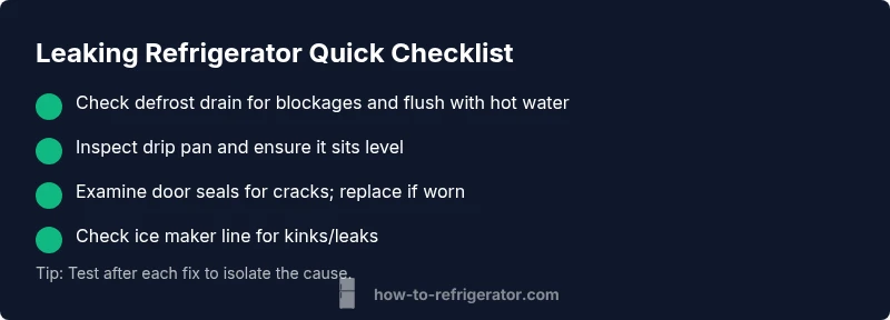 If you’re asking why would a refrigerator leak, you’re not alone. Most leaks come from a handful of common culprits rather than a dramatic failure inside the machine. According to How To Refrigerator, start with the easiest checks: the defrost drain, door gaskets, drip pan, and any water lines connected to an ice maker. By isolating the source, you can often stop the flow without expensive repairs. This section explains the typical patterns you’ll see and why they happen, so you can act quickly and safely.
