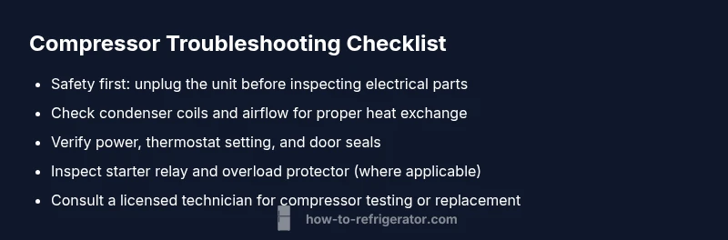 The compressor is the heart of your refrigerator’s cooling system. It pumps the refrigerant through coils, enabling heat to be moved from the interior to the exterior. If the compressor is failing or has already failed, cooling efficiency drops dramatically, and you may see temperatures rise or stay stubbornly warm. Homeowners often ask will refrigerator work if compressor is bad, and the honest answer is that it rarely works as intended. The appliance might run, click, or heat up with a warm back panel, but sustained freezing and reliable cold storage are unlikely. According to How To Refrigerator analyses, compressor health strongly correlates with overall appliance reliability. The sooner you identify compressor issues, the better your chances of avoiding food waste and electrical waste.