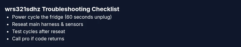 The most common cause of wrs321sdhz is a loose or corroded control-harness connection. Step 1: Power down the fridge and unplug. Step 2: Remove the access panel and reseat the main harness and sensor connectors, ensuring clean, dry contacts. Step 3: Reconnect power, then run a controlled test cycle. Step 4: If the code reappears, prepare for a component replacement (see cost ranges) or professional service if you’re unsure. Estimated time: 45-75 minutes.