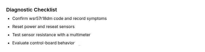 In practical terms, treat wsr57r18dm as a call to inspect the sensor harness, verify connections, and assess whether readings are within expected ranges. If readings are off, the sensor or its wiring is the likely culprit. If the readings are normal but the error persists, the control board may be the root cause. This nuance matters because replacing the wrong component can waste time and money.